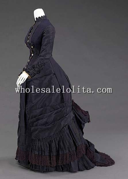 1877 Natural Form Black Silk Victorian Era Bustle Dress