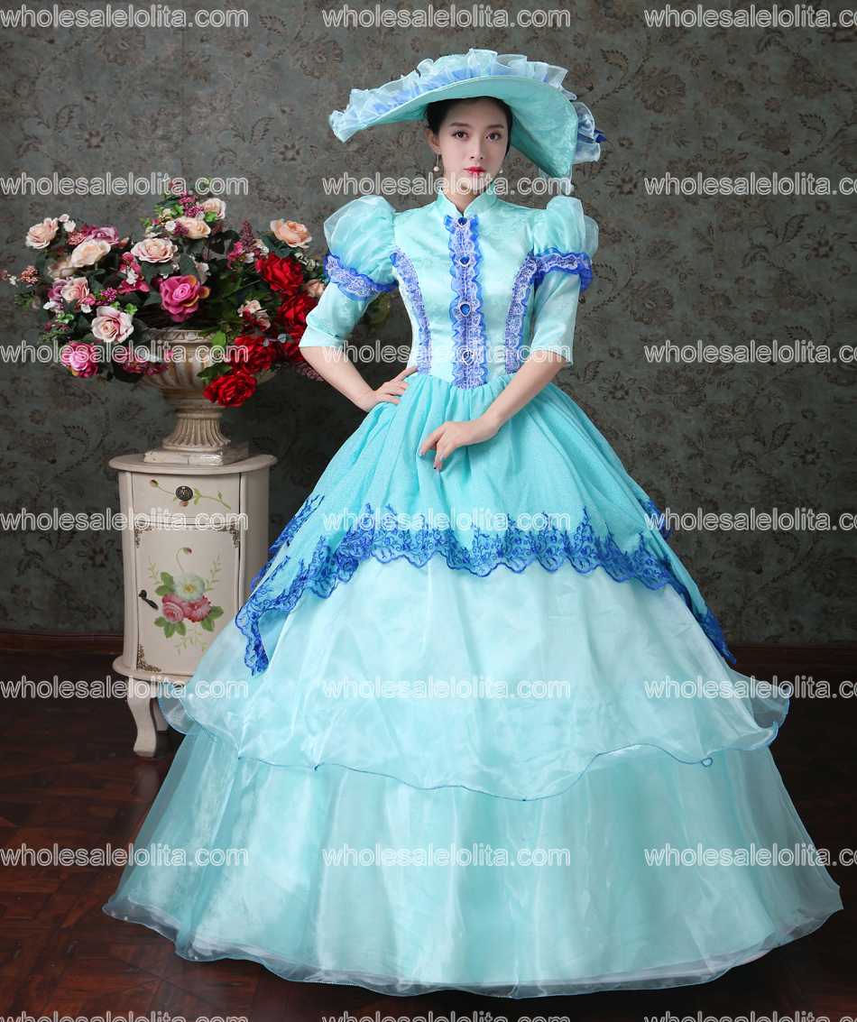 18th Century Sky Blue Lace Vampire Masquerade Ball Dress Civil War Southern Belle Ball Gown
