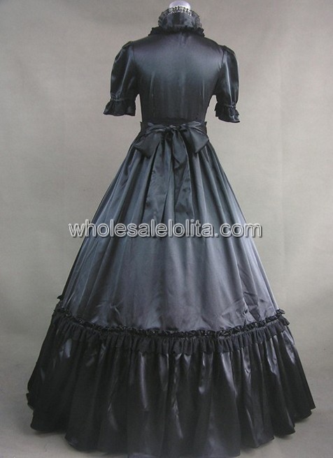 19th Century Black Satin Gothic Victorian Dress Halloween Masquerade Ball Gown