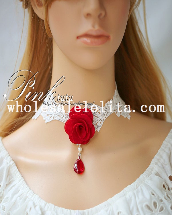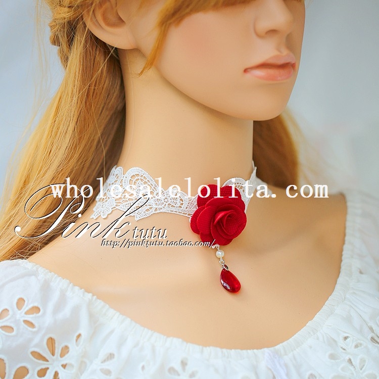 Fashion Bride/Bridesmaid Collar Choker White Necklace with Red Rose and Ruby Pendant
