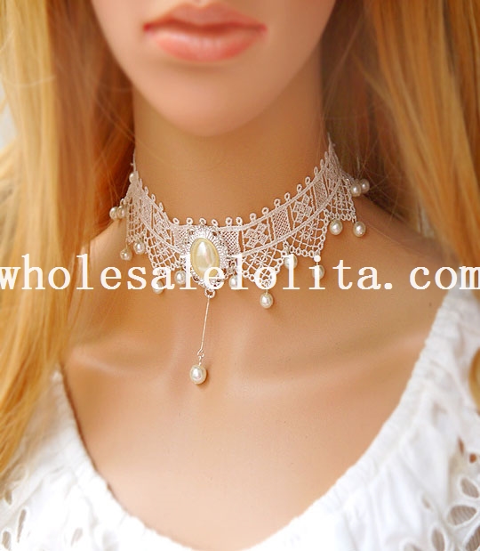 Fashion White Lace Gothic Collar Choker Pearl Pendant Necklace for Bride's Accessory