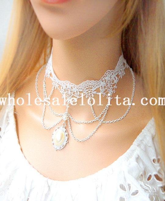 Royal White Lace Gothic Collar Choker Pearl Pendant Necklace