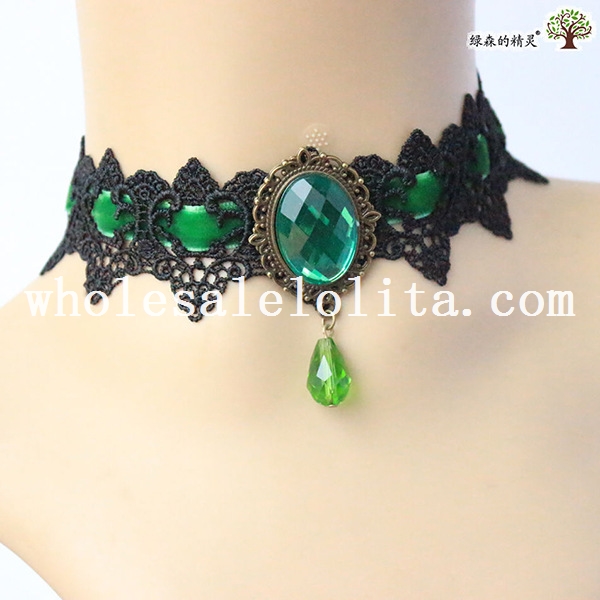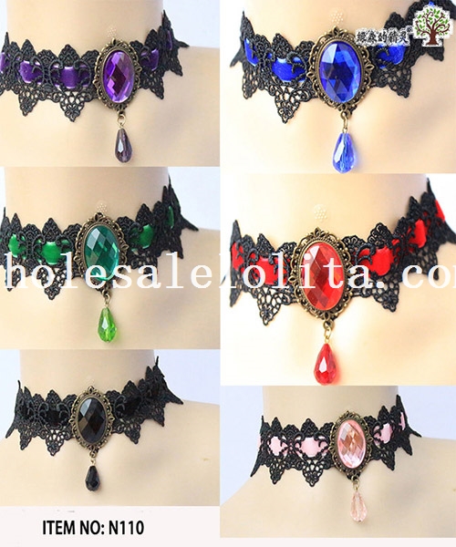 Vintage Gothic Collar Choker Gem Pendant Lace Necklace Available for Many Colors