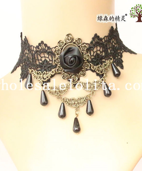 Women's Handmade Pendant Black Lace Collar Choker Necklace with Rose